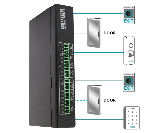 Two Door Access Controller - COSEC ARC DC200P allows seamless connection of fire alarm, as well as motion sensors and relay devices via aux ports, eliminating the need for external integration hardware