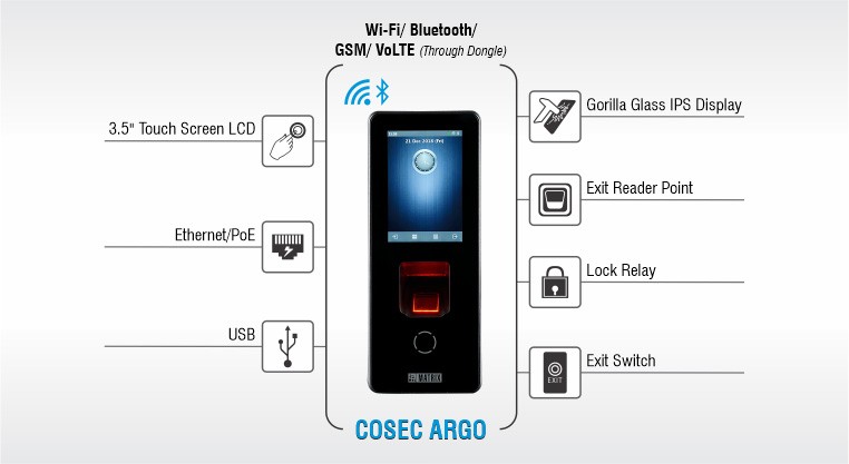 The Performance and Elegance Redefined – COSEC ARGO FOE, with EM Proximity card module, is an universal device for multiple applications such as Access Control, Time-Attendance, Cafeteria management and Job Processing & Costing that removes the need of dedicated hardware for diverse solutions.