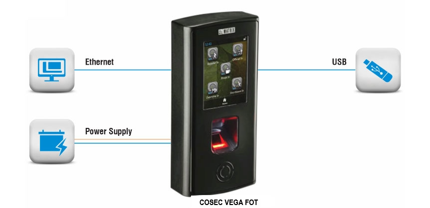 Focused on the exquisitie time tracking needs of an organization, COSEC VEGA FOT, a part of VEGA series, brings to you a complete advantage in time attendance. A well-engineered Terminal, this device can be used for various applications like Time-Attendance, Job Processing and Costing, and Cafeteria Management. With EM Proximity Card module, COSEC VEGA FOT gives the best for organizations alongwith biometric credentials.