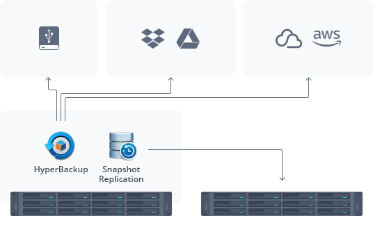 Back up files, iSCSI LUNs, installed applications, and system configurations to destinations including Synology C2 Storage, public cloud platforms, USB devices, file servers, local folders, or other Synology NAS.