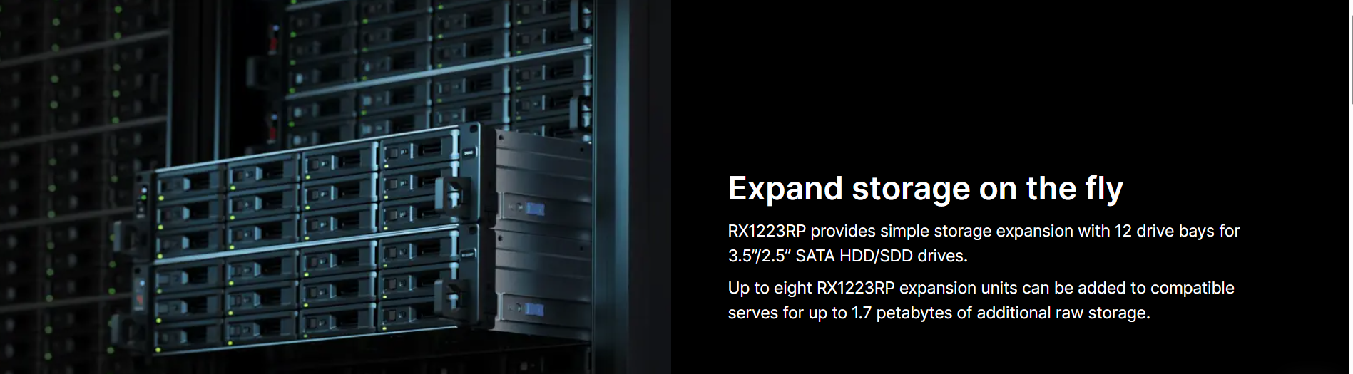 Add up to 96 storage bays to compatible units with Synology Expansion Unit RX1223RP. Enlarge or create new volumes without system or service downtime thanks to online storage expansion.