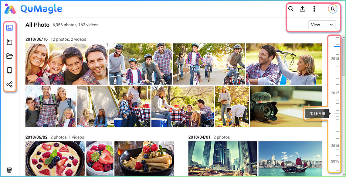 QuMagie integrates QuMagie Core AI image recognition technology for facial recognition, subject identification, and geotagging photos. Similar photos are categorized into People, Places, and Things albums. QuMagie also features a built-in timeline scroll, customizable folder covers, iOS® Live Photo display and a powerful search tool, to provide you with the ultimate photo management and image sharing solution.