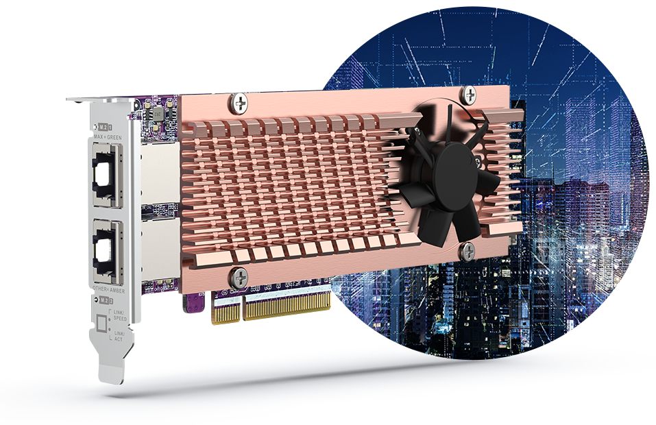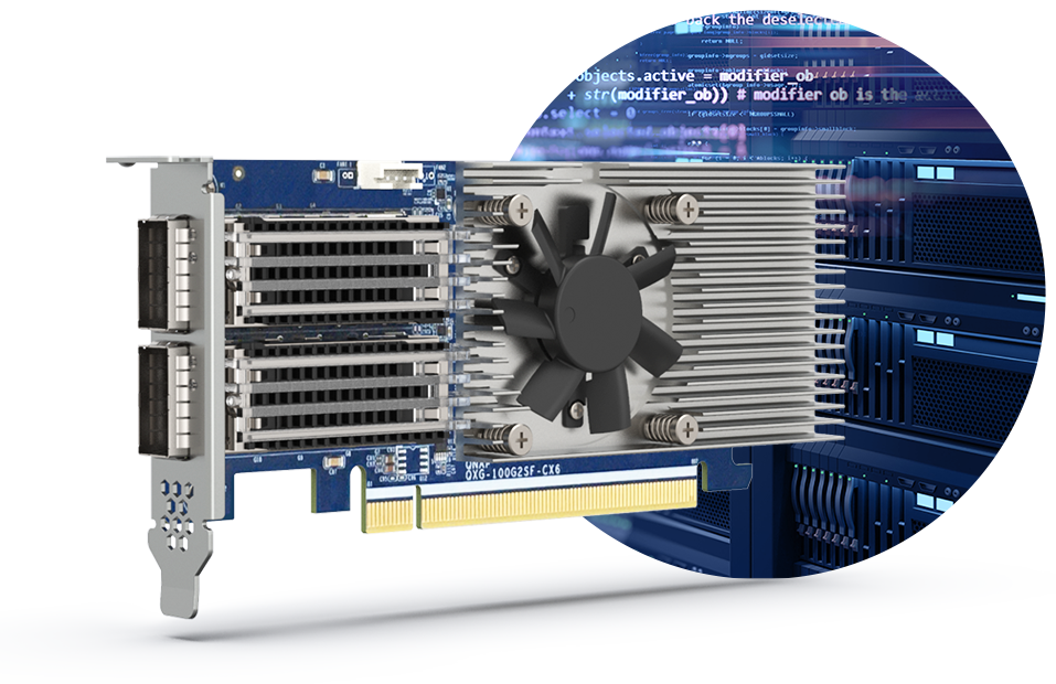 Features two PCIe Gen 3 slots for installing 5/10/25GbE network cards, QM2 cards or Fibre Channel cards.