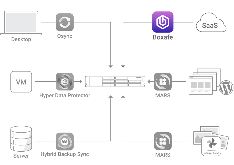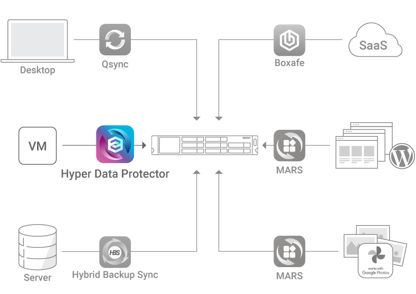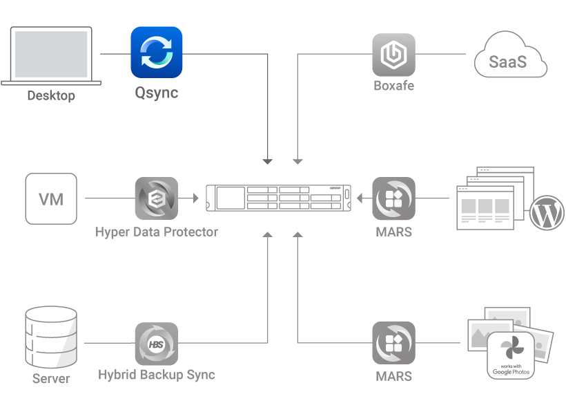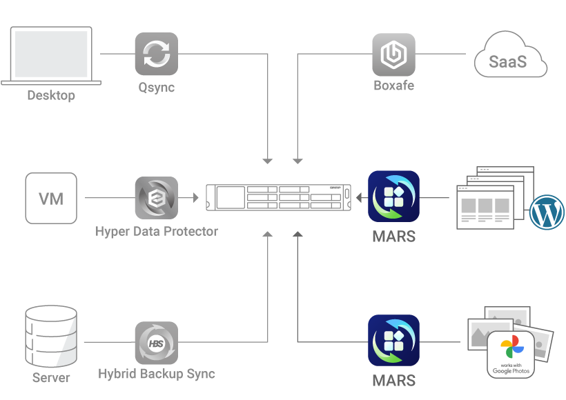 The exclusive MARS service enables backing up Google Photos and WordPress databases and files to NAS.
